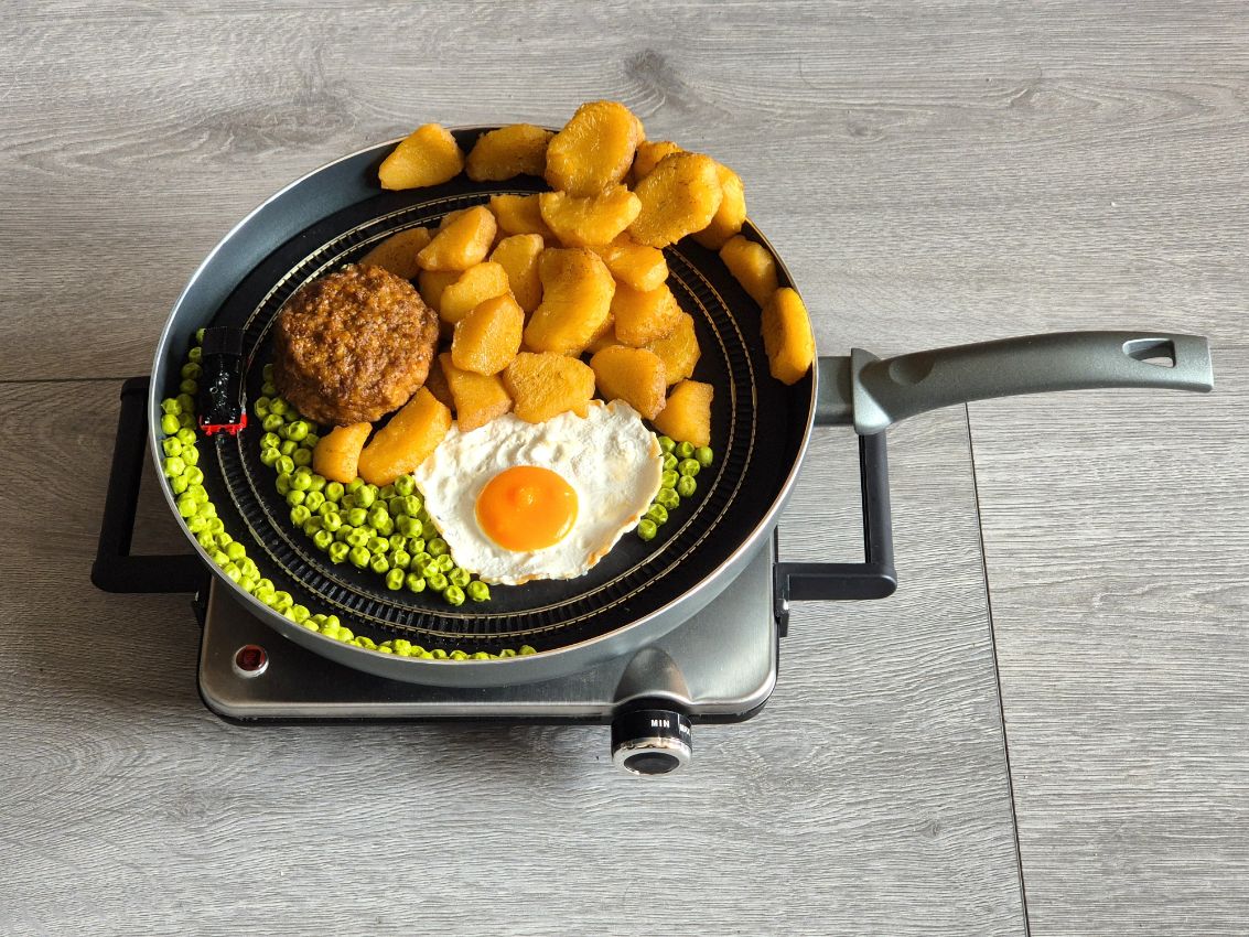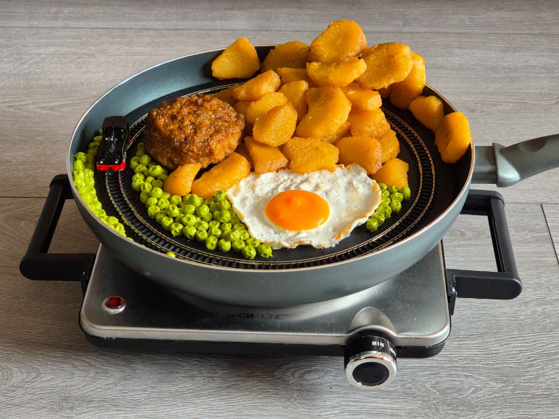 Ein Berg (samt Tunnel) aus Bratkartoffeln, ein See mit Insel als Spiegelei, eine Frikadelle bildet einen Felsen nach und das (gesunde) Grünzeug sind ein paar Erbsen. Ein paar passende Möhren fehlen noch.