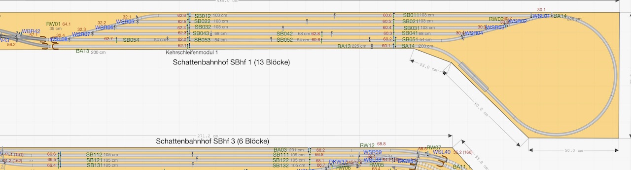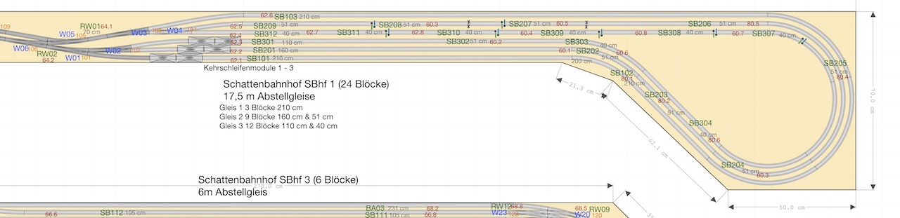 Gleis 1 ist speziell auf lange Einheiten ausgelegt und verfügt daher nur über drei Blöcke. Die beiden anderen Gleise sollten möglichst flexibel bleiben, weshalb die Blocklängen auf 51 cm (Gleis 2) bzw. 40 cm (Gleis 3) festgelegt wurden – idealerweise etwa die Hälfte bis ein Drittel eines typischen Zuges.