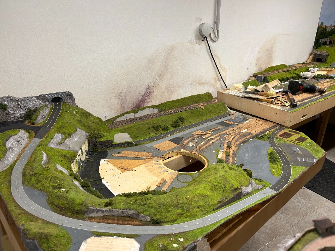 Leider musste ich im Sommer 2025 meine Arbeiten an der Anlage unterbrechen, da ich in meinem Keller Renovierungsarbeiten wegen feuchten Wänden durchführen musste. Ein mittlere bis große Katastrophe. War ich doch kurz meinen 2. großen Bahnhof und die Landschaft rundum fertig zu stellen.