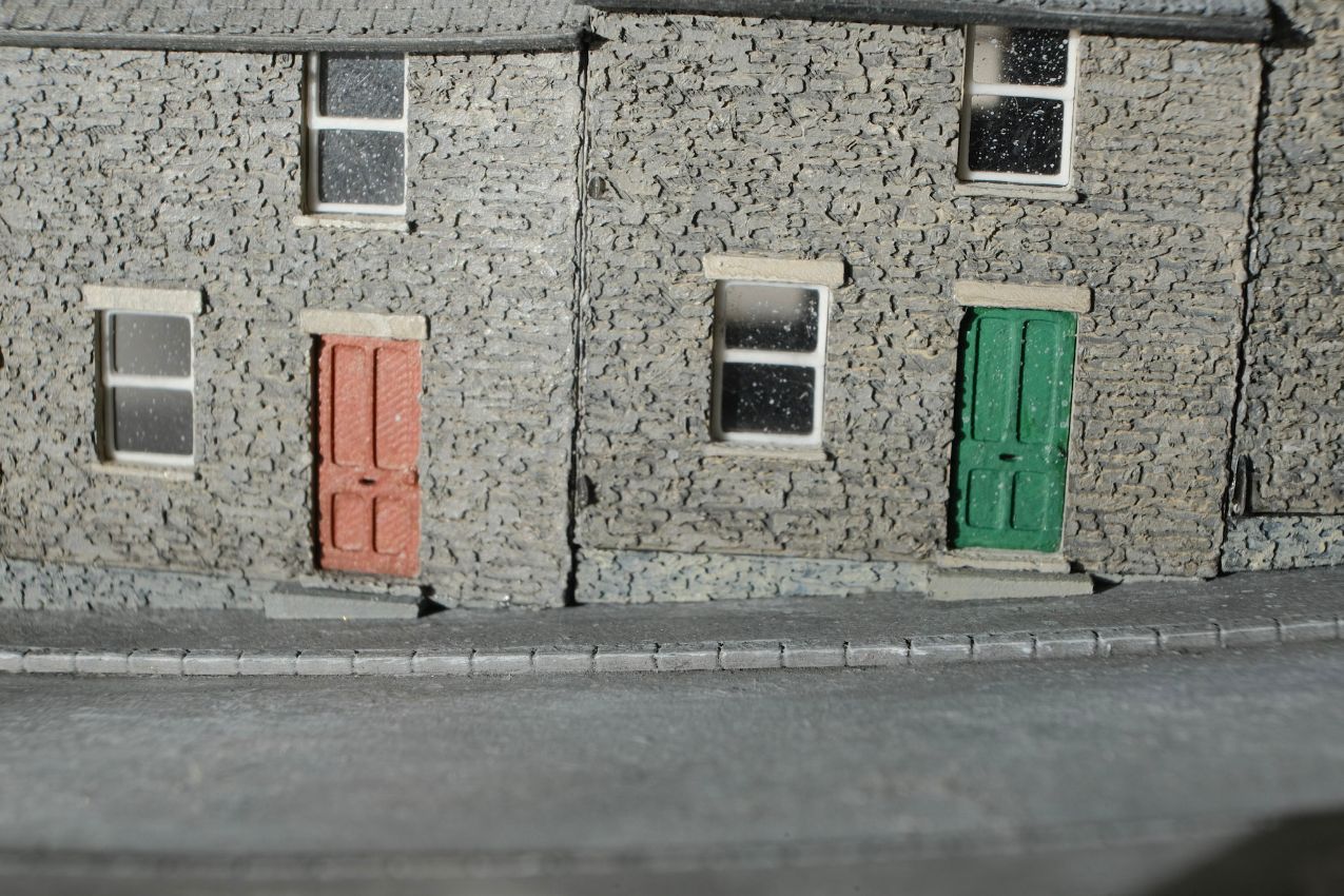 Etwas naiv bin ich an die Sache schon herangegangen, denn als ich die drei Häuser fertiggestellt hatte, stellte sich die Frage, wie dieser gestufte Bau jetzt eigentlich auf der Anlage zu stehen kommen soll. Die „umgekehrte Stufe“ aus Styrodurteilen zu schneiden hat nur leidlich funktioniert. Schließlich habe ich noch weitere Mauer-Dreiecke gedruckt, welche von unten an die Häuser geklebt wurden (und noch mal angemalt werden mussten …), so dass sich jetzt eine durchgehende, wenn auch geneigte Grundfläche ergab. In der Form habe ich die Gebäudezeile auf einen Gehsteig aus Graupappe kleben können, der wiederum mit ebenfalls 3D-gedruckten Randsteinen in die Straße übergeht, deren Oberfläche ebenfalls aus Graupappe besteht. Auch hier habe ich ziemlich viele Farbschichten, Tupfer, Ausbesserungstücke etc. übereinander gemalt, bis ich einigermaßen mit der Wirkung der Straße zufrieden war. Neben der passenden Helligkeit war auch die Wärme des Farbtons richtig einzustellen, damit er sich nicht mit den anderen Steinfarben auf der Anlage beißt. Wahrscheinlich ist das ganze Arrangement immer noch einen Tick zu dunkel geraten, aber bei guter Beleuchtung passt es.