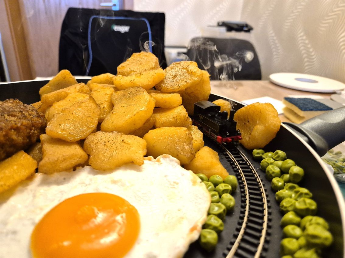 Ein Berg (samt Tunnel) aus Bratkartoffeln, ein See mit Insel als Spiegelei, eine Frikadelle bildet einen Felsen nach und das (gesunde) Grünzeug sind ein paar Erbsen. Ein paar passende Möhren fehlen noch.