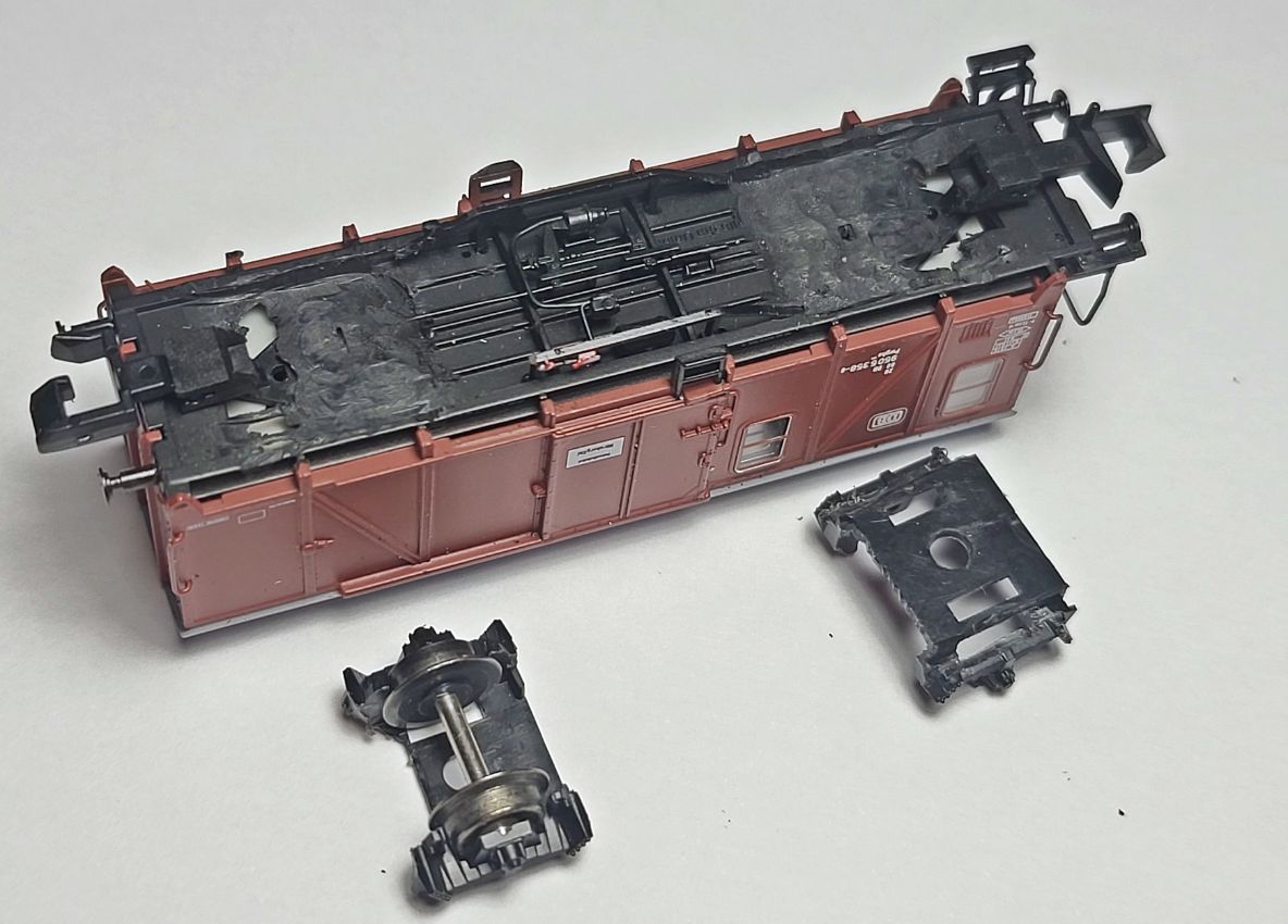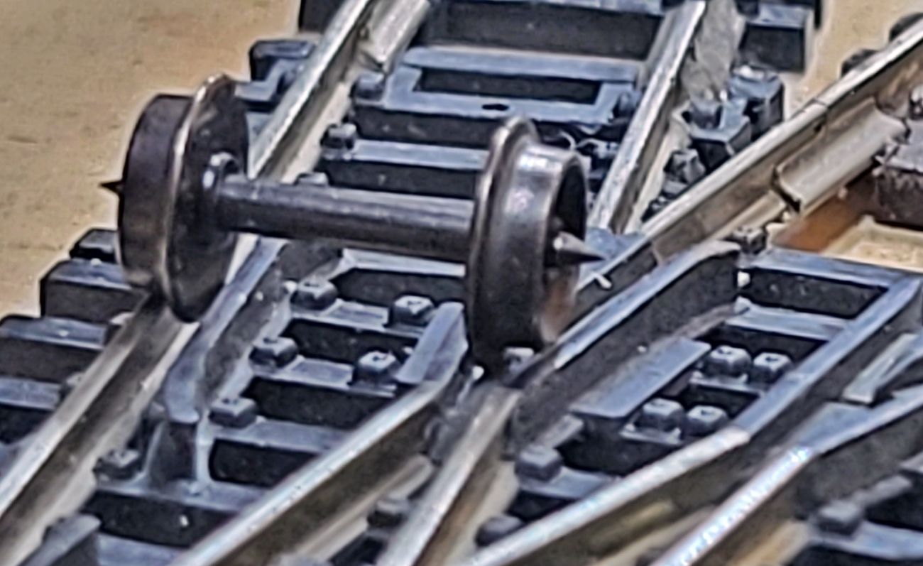 Die Räder sind mit 5,1 mm viel zu klein, deshalb wurden die Achslagerhalter nach unten verlängert und die Achse sitzt zudem etwas außermittig nach unten bzgl. den Achslagernachbildungen. Das wäre ggfs. noch verschmerzbar gewesen, wenn nicht weitere Probleme im Fahrbetrieb dazugekommen wären. Die relativ schmalen Radlaufflächen fallen erwartungsgemäß in die Herzstücklücke und klemmen noch dazu in Roco Weichen fest, weil die Radsatzabmessungen mit dem gegenüberliegenden Spurkranz ausgerechnet den Radsatz in der Lücke mit dem Außenrand festklemmen.