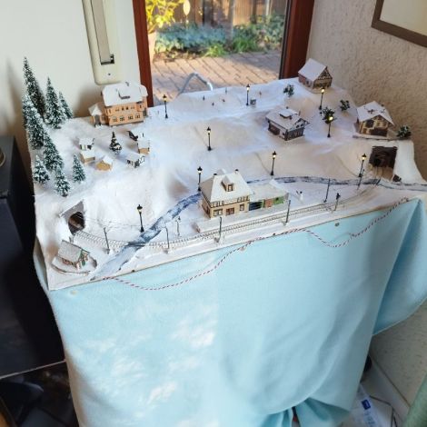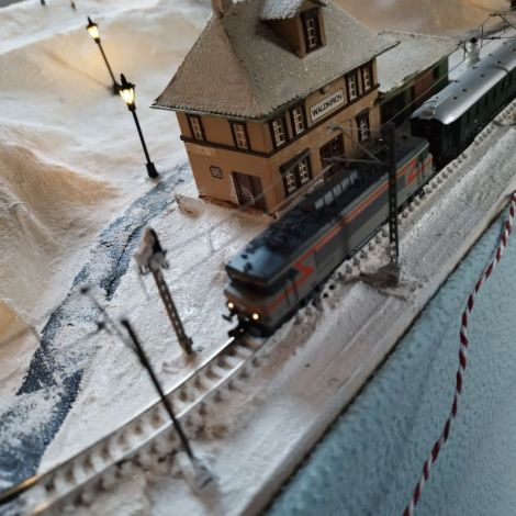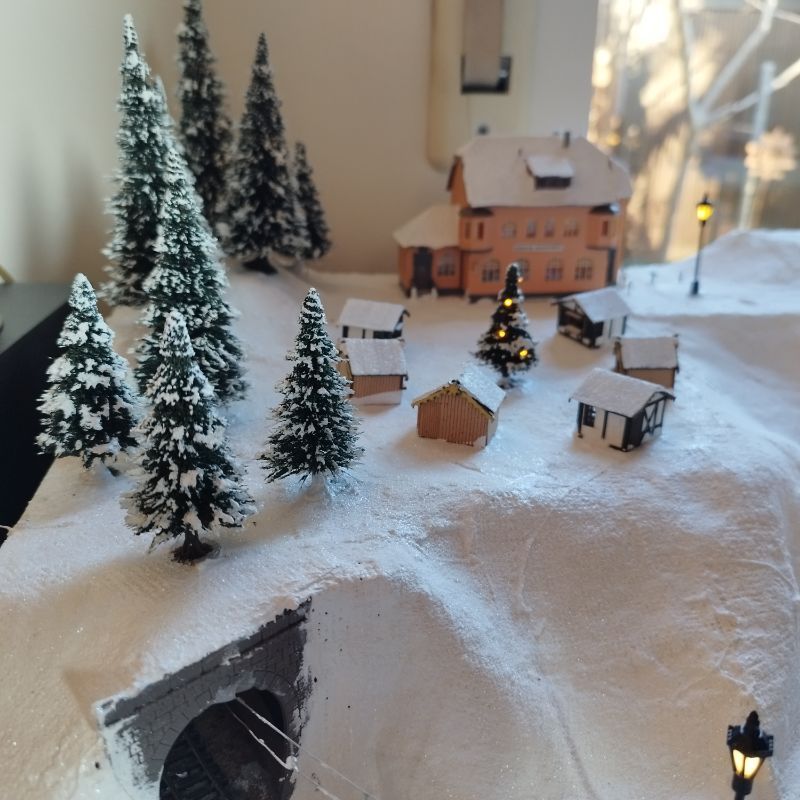 Die Gleise sind von Minitrix! Ansonsten Faller 170468 Schneepulver zum Einsatz! Der Unterbau besteht aus Fliegennetz und Holz/Styrodurkonstruktion, sowie Gipsbinden für die Geländeformung! Diverse Häuser (teilweise Fertigbausätze aus Privatverkauf), sowie das Haus vom Weihnachtsmann (DM-Toys) kamen zum Einsatz. Die Busch-Signale sind dauerhaft auf grün (Fahrtrichtung) und rot gestellt (keine externe Steuerung)! Die Laternen konnte ich günstig (1.69 € pros Stück) bei einem LED-Anbieter besorgen!