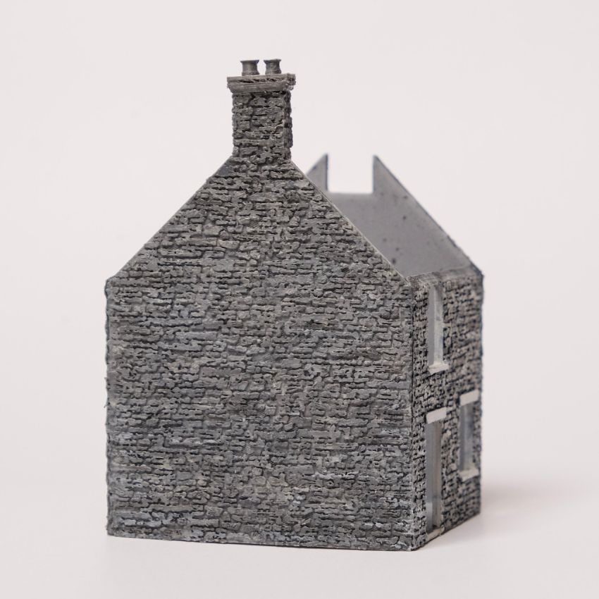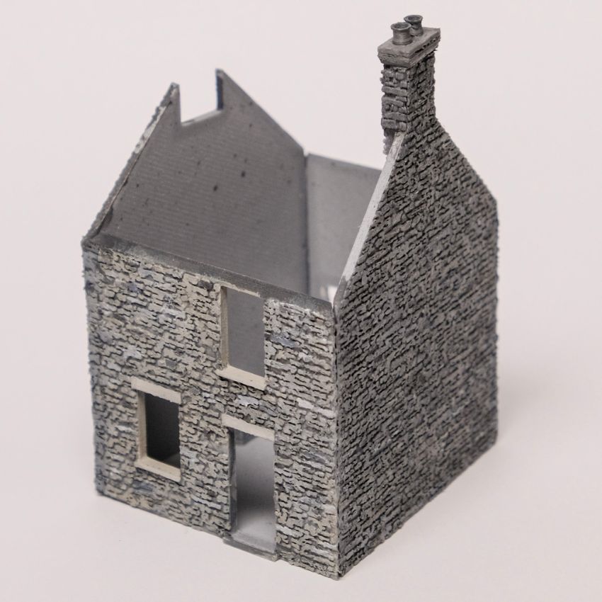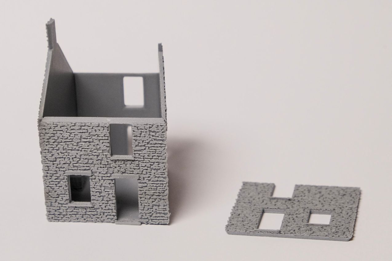 Der wesentliche Unterschied zu den anderen in dieser Serie beschriebenen Bautechniken besteht natürlich darin, dass die Bemalung nun manuell geschehen muss. Damit diese realistisch wirkt, sind einige Farbschichten und einige Detailarbeit notwendig. Ich habe zunächst die Gebäude montiert (sie bestehen aus einzeln ausgedruckten Wänden, die Flach am Druckbett liegend gedruckt werden) und dann die strukturierten Fassadenteile dunkelgrau grundiert. Sodann wurden die Steinoberflächen mit einem halbtrockenen Pinsel und anderen „Tupfhilfsmitteln“ in hellem Grau abgesetzt, sowie einzelne Steine in weiteren Grautönen betont. Das ganze bekam dann diverse helle und dunkle Washes, um die genaue Farbhelligkeit einzustellen und die Einzelsteine wieder aneinander anzugleichen. Am Ende habe ich noch mit einem Borstenpinsel etwas weiße Farbe fein aufgespritzt.