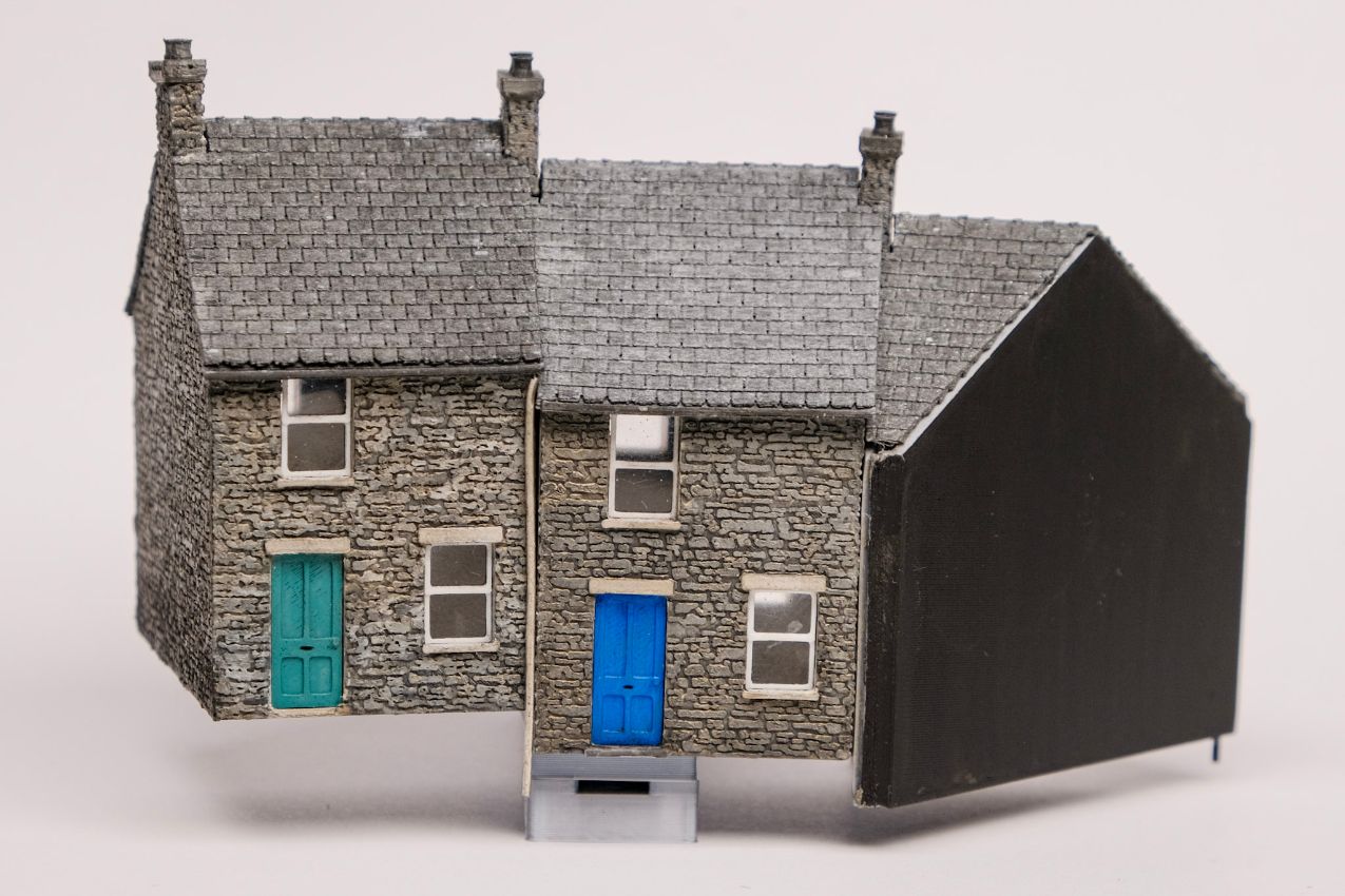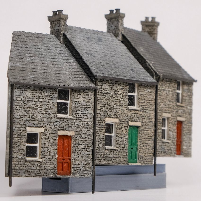 Nachdem ich meinen vor zwei Jahren angeschafften FDM 3D Drucker bisher eher für größere Maßstäbe eingesetzt habe (siehe hier https://www.stummiforum.de/t225258f47-SpurG-D-Neue-Modelle-fuer-Kupzingers-Grasbahn.html und hier https://www.stummiforum.de/t226221f47-Neue-Modelle-in-Spur-K-KKStB-Reihe.html) war jetzt Vertrauen genug aufgebaut, auch in Spur N etwas Anschauliches produzieren zu können. Die Wahl fiel auf eine kleine Reihenhaus-Zeile. Ich hatte bereits vor einiger Zeit aufgrund von Fotos ein typisch schottisches „Cottage“ in Tinkercad konstruiert. Aber erst die Entscheidung, eine Hausreihe in Kurve und Steigung darzustellen, brachte den erwünschten optischen Pep, der mich zur Umsetzung antrieb. Die Häuser stehen am linken Anlagenrand und verdecken das linke Gleisende.