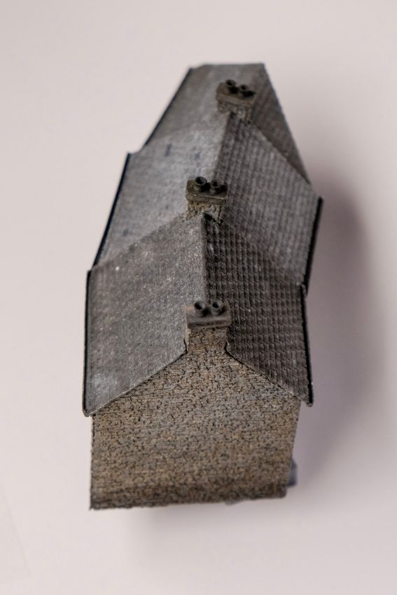 Die Dächer wurden ebenfalls gedruckt, sie bestehen jeweils nur aus einem Teil mit angesetzten Schornsteinen. Die Dachrinnen konnte ich gleich mit andrucken. Hier war ich besonders froh, diese aufgrund des Kurvenverlaufs sehr kompliziert geformten Trapeze nicht per Hand aus irgendwelchem Karton ausschneiden zu müssen. Im CAD konstruiert hat alles beim ersten Versuch (fast) perfekt gepasst.
