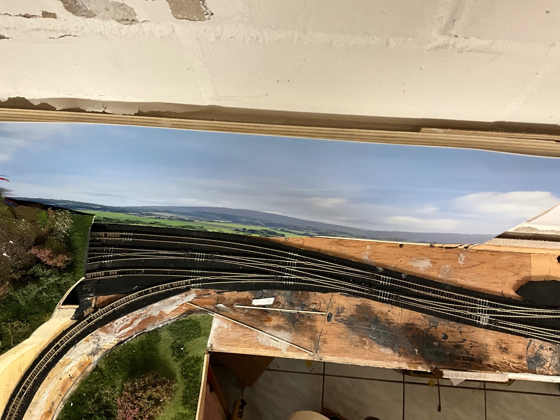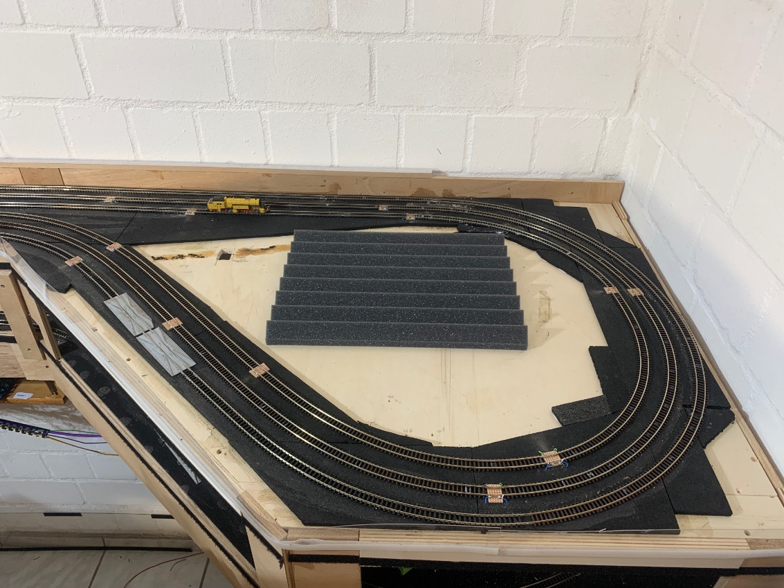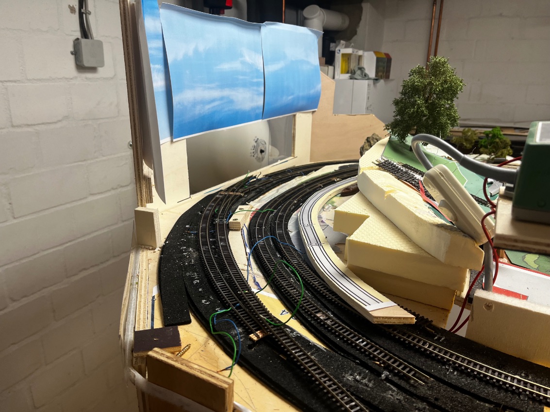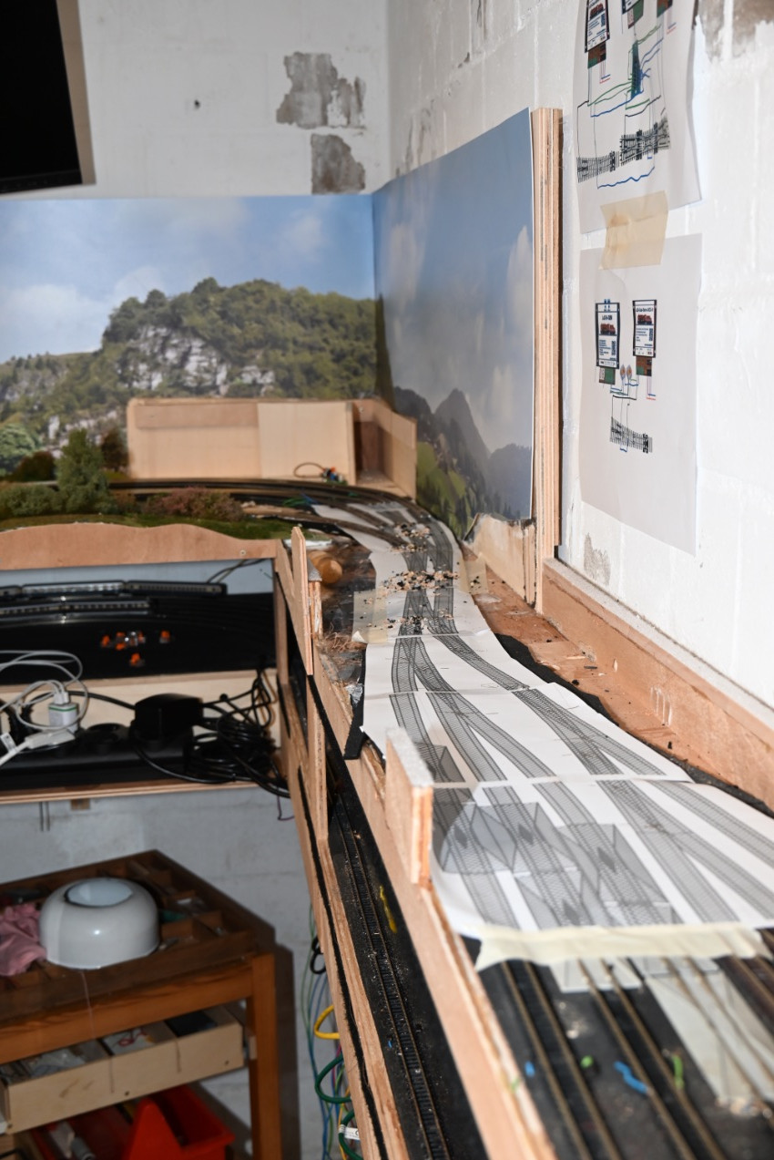 Neben der Zufahrt zu den Schattenbahnhöfen habe ich zwei Weichenstraßen komplett neu gebaut (in dem Zusammenhang habe ich auch den Zufahrt zu oberen Schattenbahnhof nochmal anpassen müssen). Da ich vier DKW bzw. Kreuzungen durch jeweils zwei Weichen ersetzt habe, war ein Anpassung der Landschaft notwendig. Dies erforderte ein zersägen meines ersten Landschaftsprojektes Burg auf Berg. Zugleich hat es mir ermöglicht die Zufahrt zum Schattenbahnhof besser in die Gestaltung der Anlage zu integrieren.
