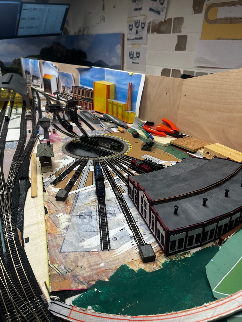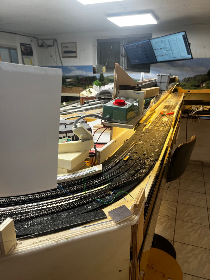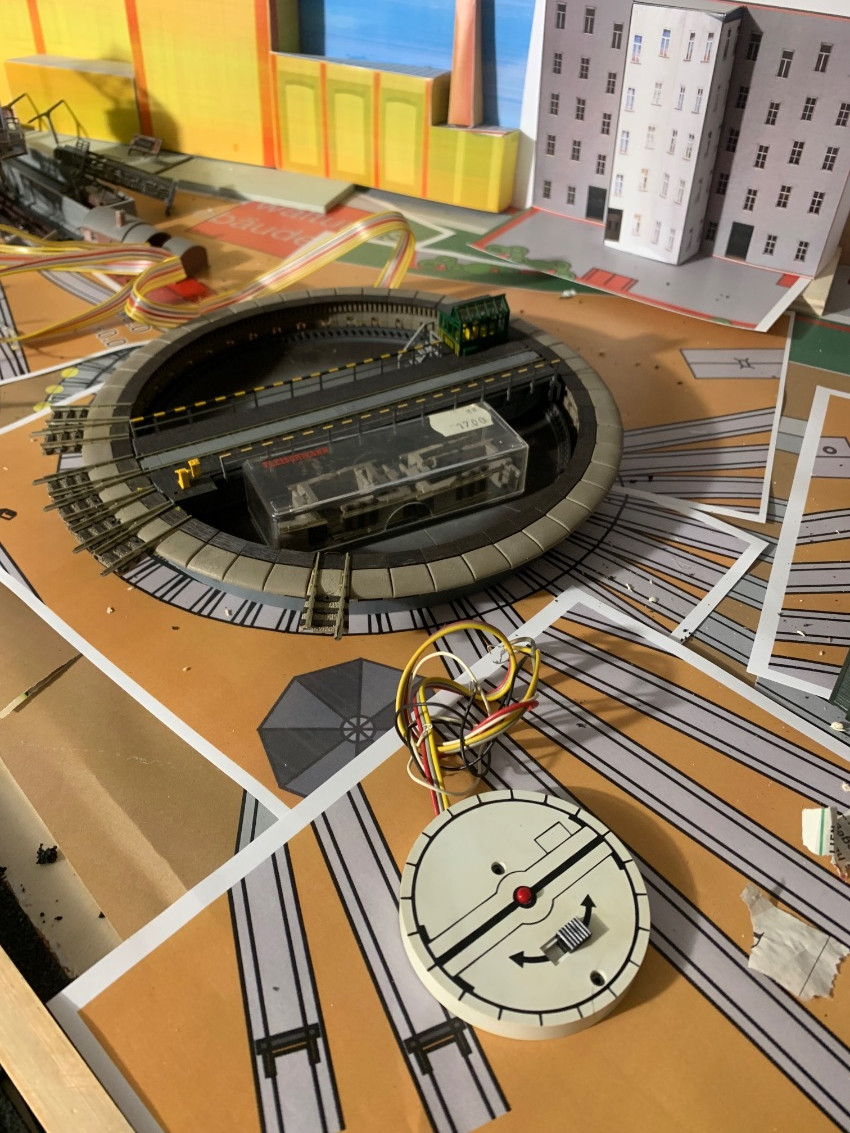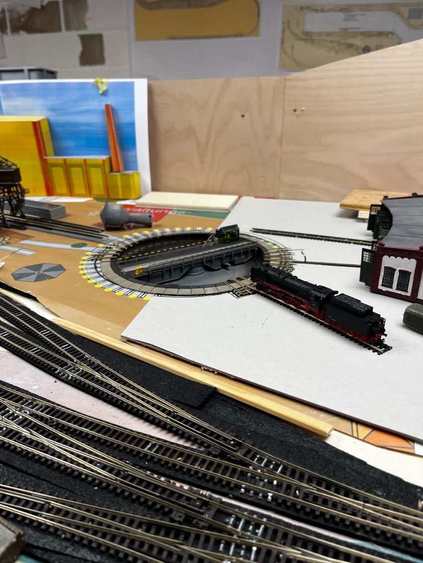 Auch mit dem BW habe ich dann doch schneller Fortschritte gemacht als ich dachte. Zunächst habe ich ja versucht, die Drehscheibe zu digitalisieren (https://www.1zu160.net/scripte/forum/forum_show.php?id=1441102). Das ist nicht vom Tisch, aber analog drehen bereitet zunächst auch ausreichend Freude :-) Um die Verbindung der Peco-Gleise an die Fleischmanndrehscheibe zu ermöglichen, habe ich mich hieran https://youtu.be/Cpsa67T26Ac?si=5AfKhEqdciYBqifj orientiert, wobei ich die Schiene als ganzes ausgetauscht habe. Zusätzlich habe ich die Gleise um knapp 1,5 mm durch Plastik unterlegen erhöht. Das Fleischmann-Schotterbett ist etwas höher als das Pecogleis. Noch habe ich die Gleise nicht verklebt. Ich rechne damit die Drehscheibe nochmal ausbauen zu müssen, wenn ich sie digitalisiere.