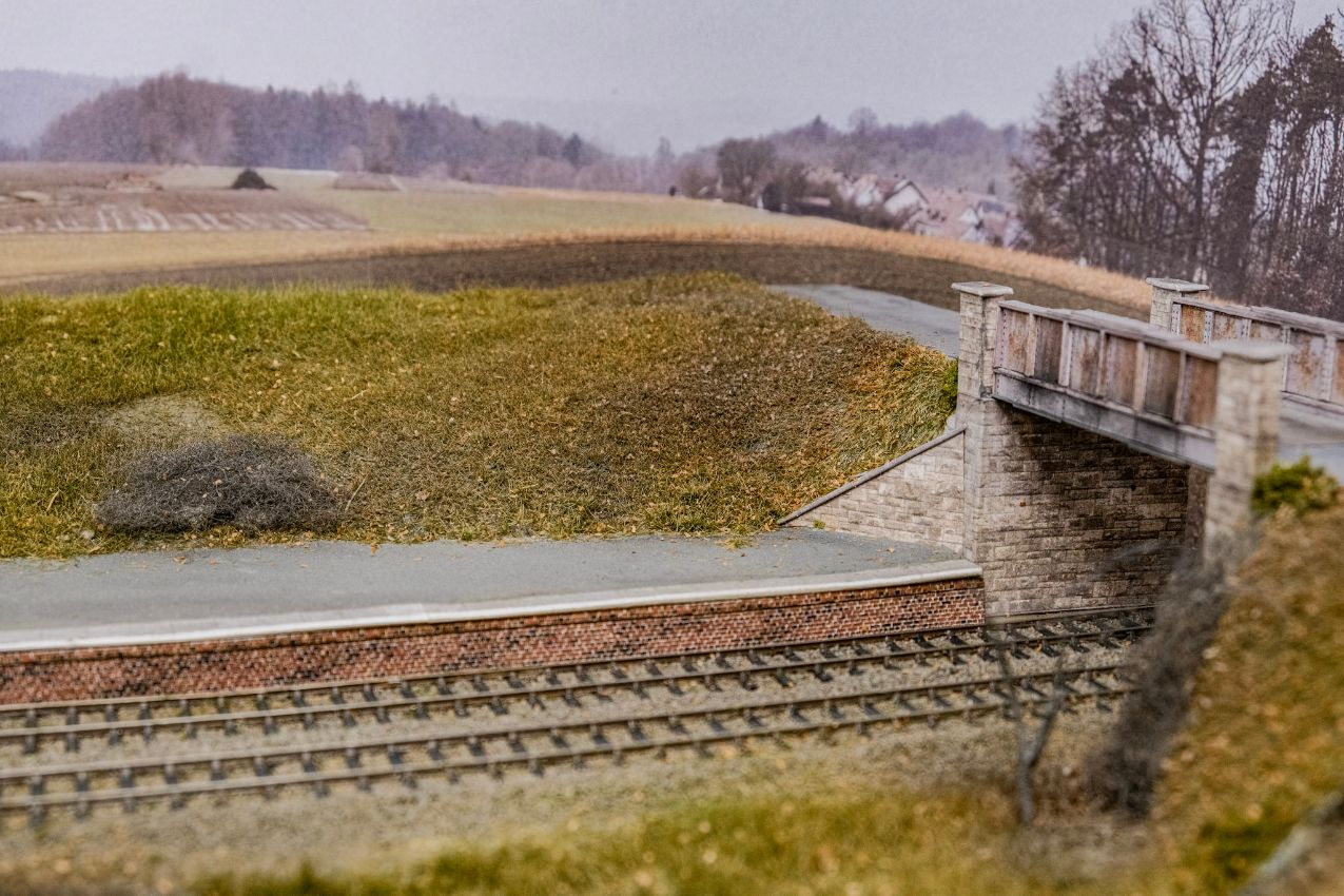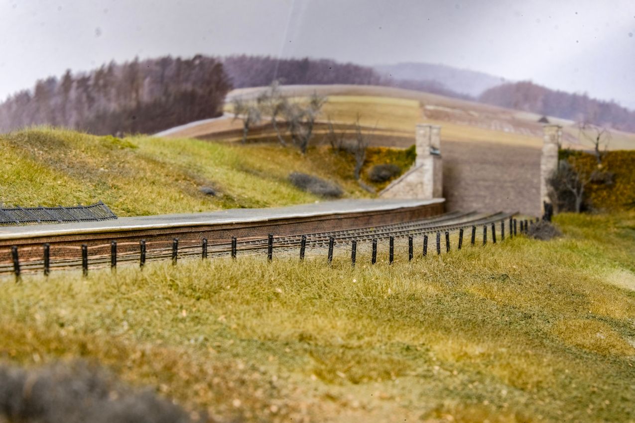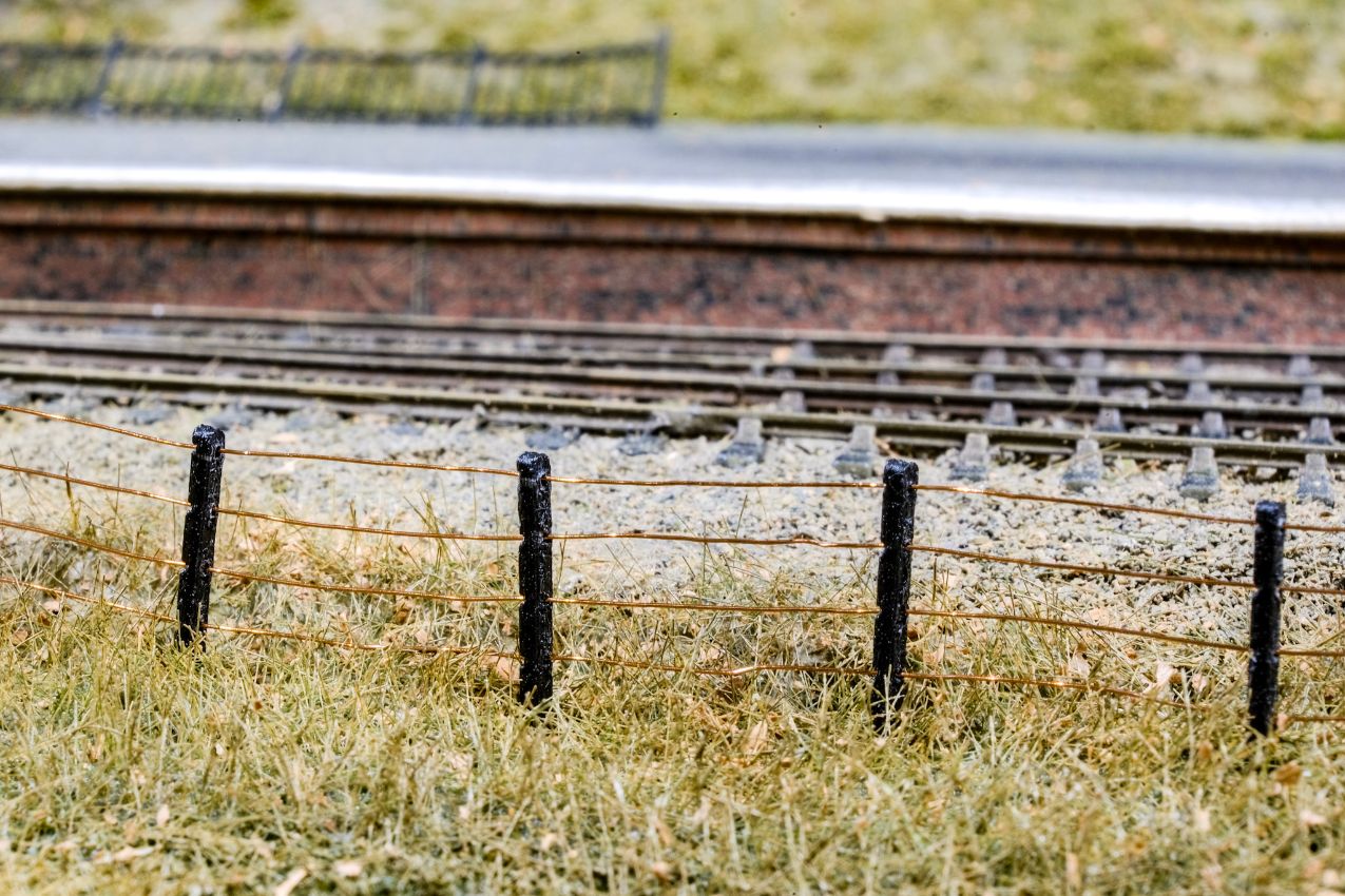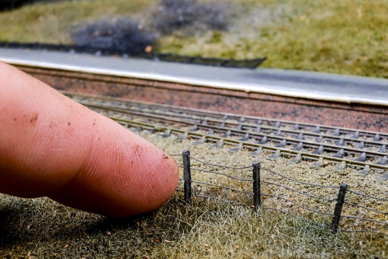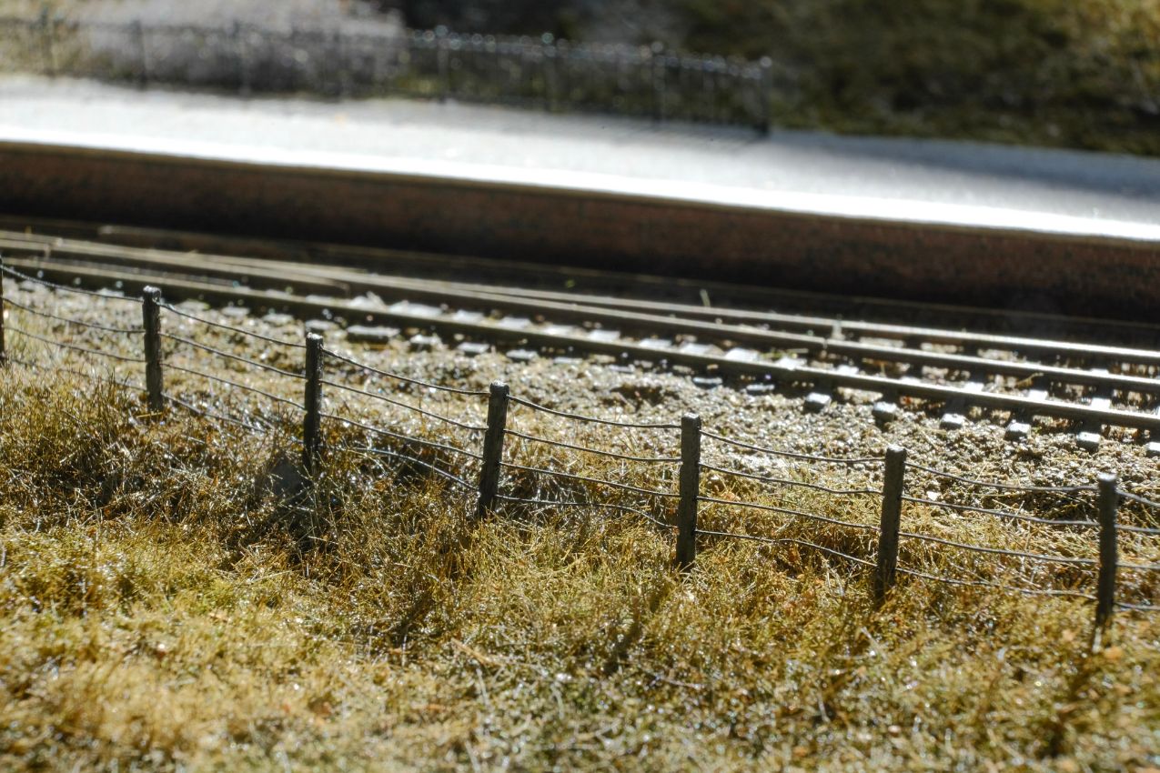 Es blieb mir nichts anderes übrig, als den Zaun doch wieder ganz zu entfernen, und den braunen Streifen mit anderen Farbtönen und etwas Streumaterial zu kaschieren. Das ist zum Glück leicht gelungen. Den Zaun habe ich dann abseits der Anlage komplett eingesprüht – es waren noch etliche Schichten notwendig. Nach dem Einstecken auf der Anlage hatten sich die Pfosten aber unweigerlich wieder verschoben, so dass tausende blanke Drahtstellen auftauchten. Diese ließen sich dann zu meiner Beruhigung doch mit Pinsel und viel Geduld wieder beseitigen.