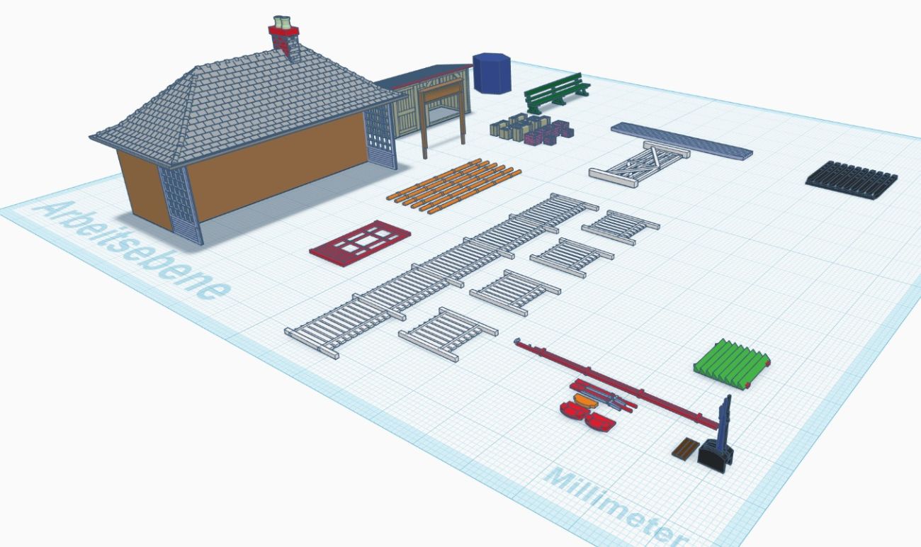 Nach und nach entstanden die Details als 3D Modell. Schuppen und Bahnübergang-Gatter stammen aus Thingyverse (jeweils adaptiert).
