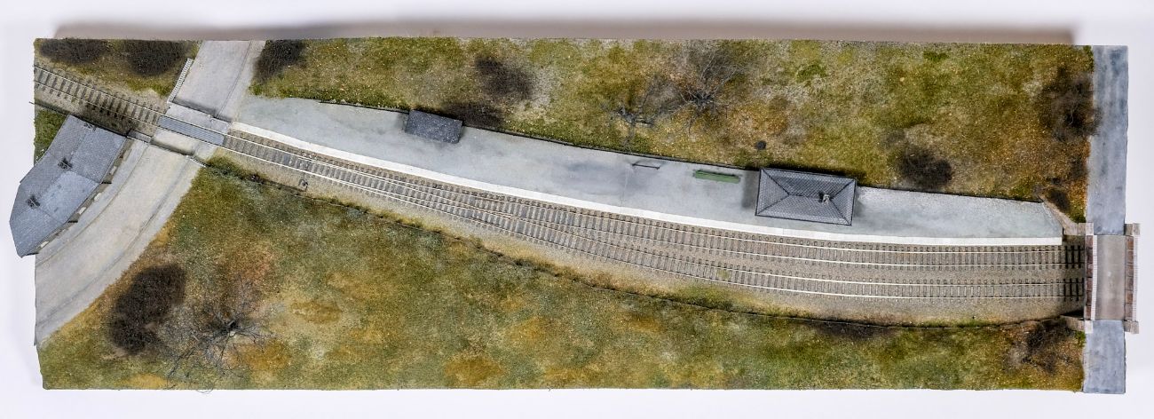 Dem kurzen Bahnsteig tut die Verkleinerung des Gebäudes sehr gut. In Ergänzung ist noch ein kleiner Holzschuppen hinzugekommen, in dem Stückgut trocken abgestellt und teilweise auch eingeschlossen werden kann.
